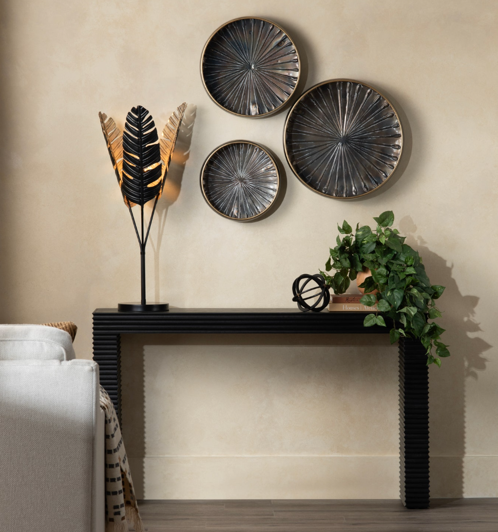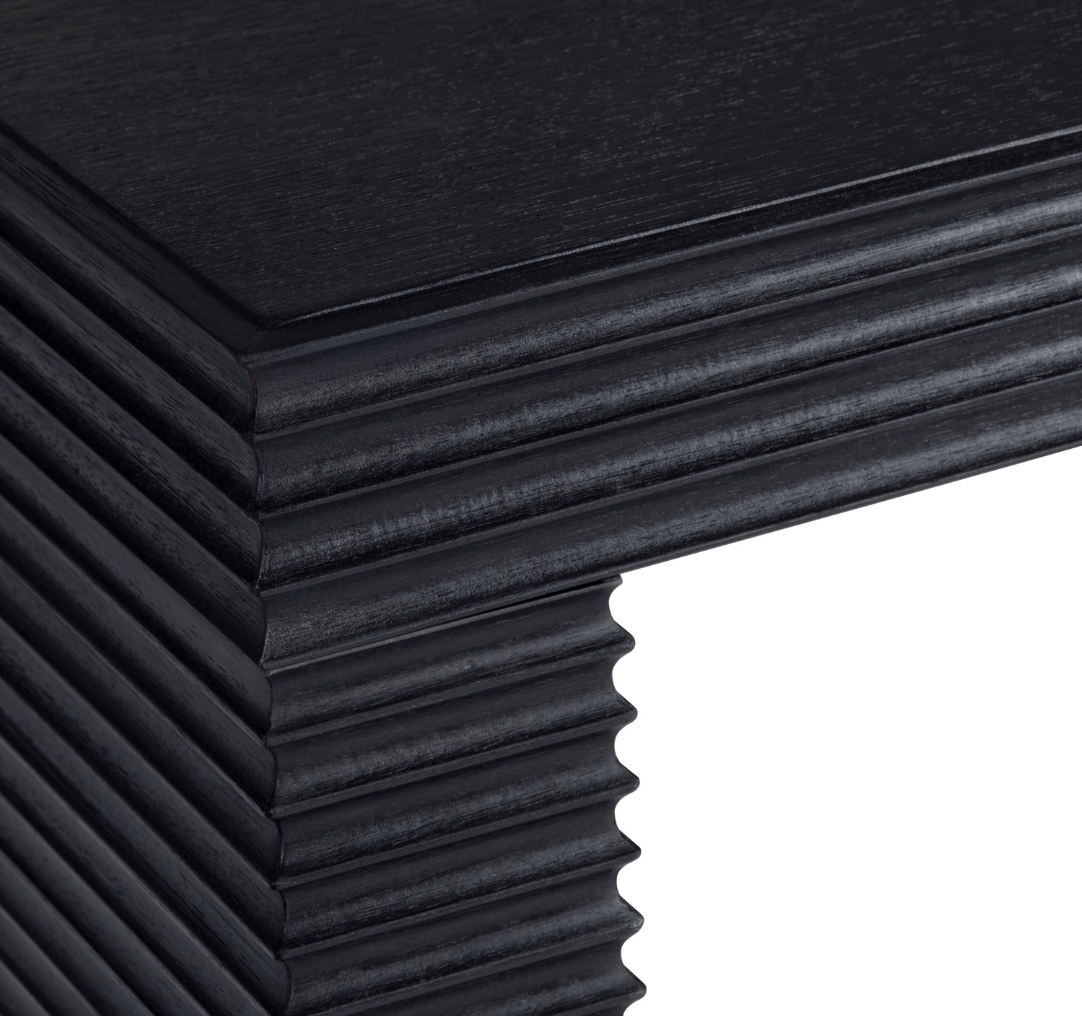 Expertly designed by Crestview Collection, the Hendrix Console Table is sleek, sophisticated and undeniably modern. This natural wood piece features a textured, ridge-style pattern that transforms a simple silhouette into a mesmerizing work of art. The organic warmth of the wood subtly peeks through a rich black finish, offering a sense of balance between nature and contemporary design. Its narrow frame makes it ideal for entryways, hallways, or behind a sofa for a streamlined, modern aesthetic in any space.