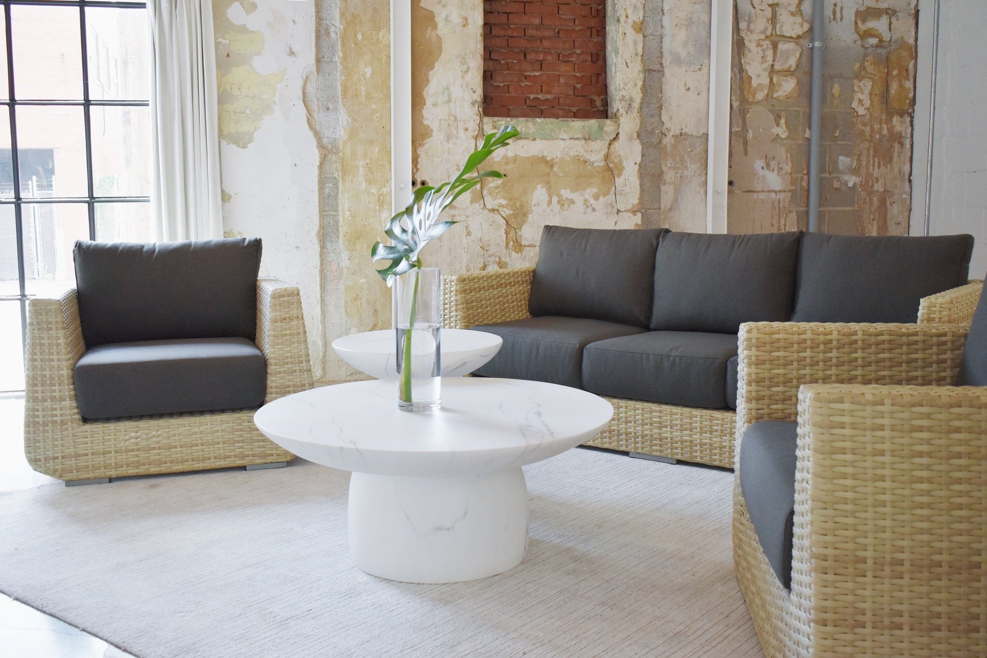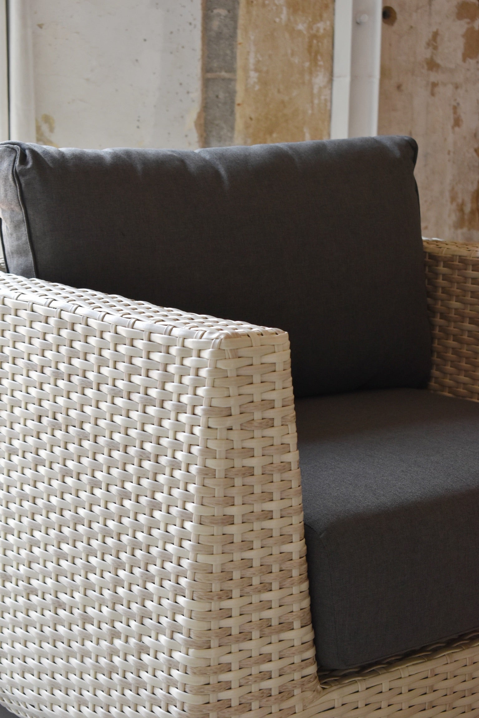 Aluminum frame with powder coating. Poly wicker weaving. Olefin fabric.