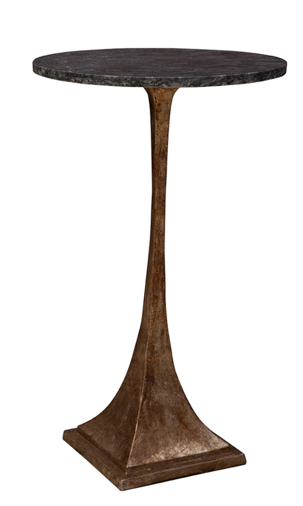 The Noelle Marble Table is a chic blend of modern and industrial design. Featuring a black marble circular top, it rests on a rustic antique-style metal base that flares out at the bottom for added stability. Perfect as a martini or side table, adding a touch of sophistication to any space.