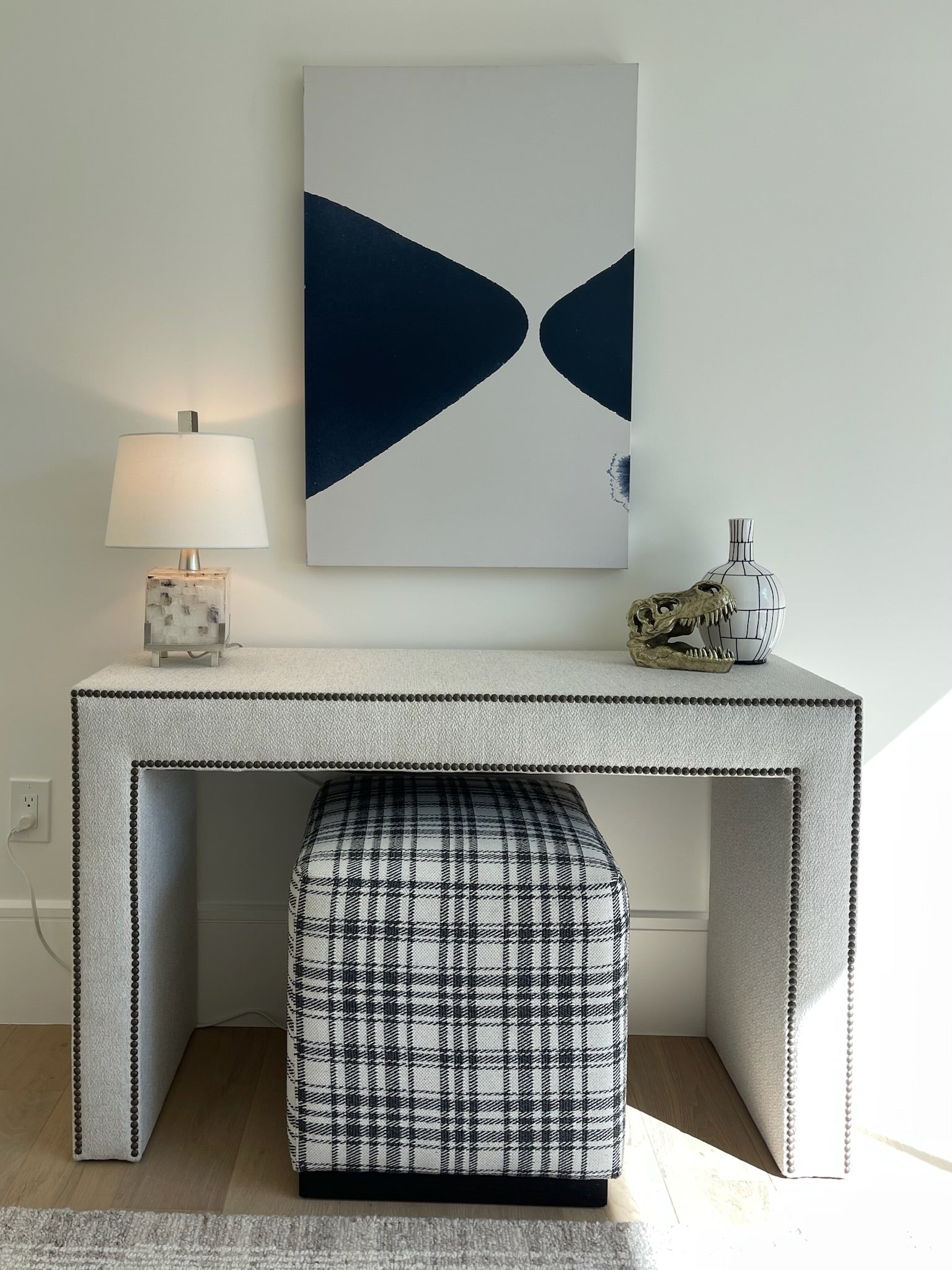 Upholstered end table with a single row of nails on the front and back. Pairs with the 132 glass top
